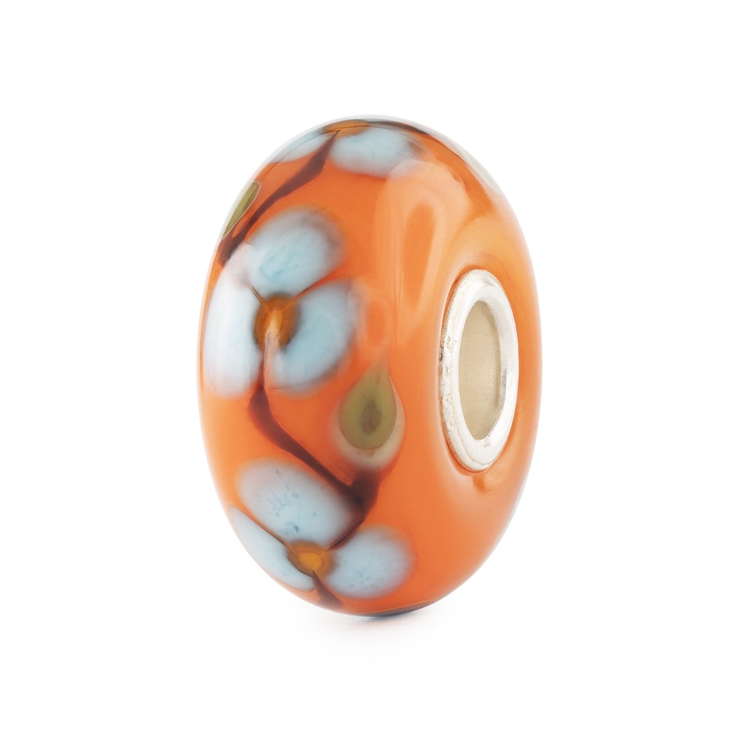 Deja que tu espíritu florezca, con pasión y sin límites. Esta bead de cristal tiene una forma clásica y una superficie suave, con detalles increíbles. Flores azules florecen sobre ramas marrones, sobre un fondo naranja oscuro e intenso.