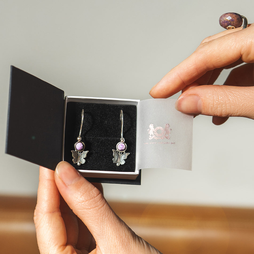 Delicadas mariposas detalladas rodean el suave Jade Púrpura, aportando una sensación de movimiento ligero y de calidez. La combinación de la plata con la piedra preciosa refleja tanto fortaleza como sensibilidad: un recordatorio elegante del equilibrio en el amor.