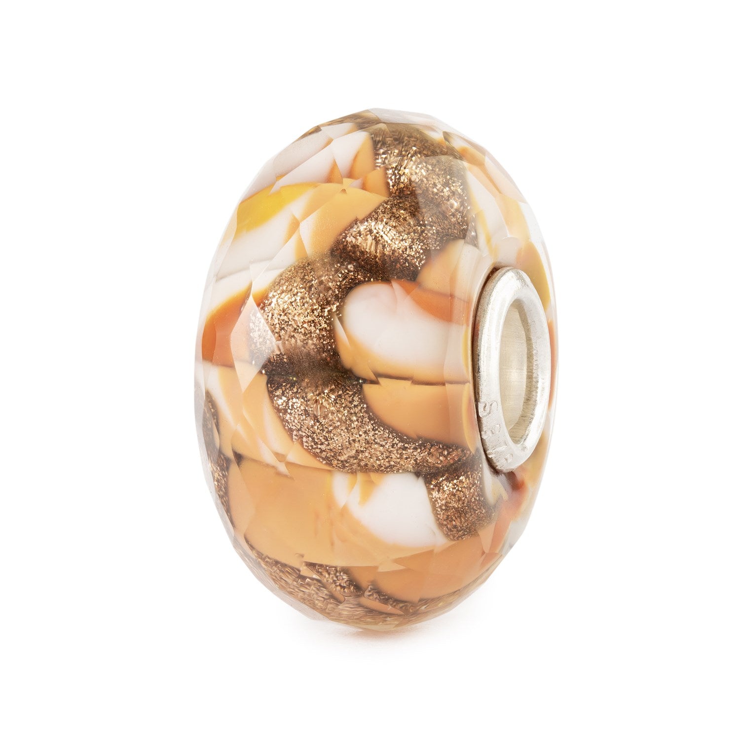 This glass bead has a facetted surface, gracefully reflecting the light and making you glow. This bead is crafted in amber and orange colour tones with a wavy design. A folded line of golden glitter runs throughout the design. The glass layers appear to fold and curve, making this bead eyecatching.