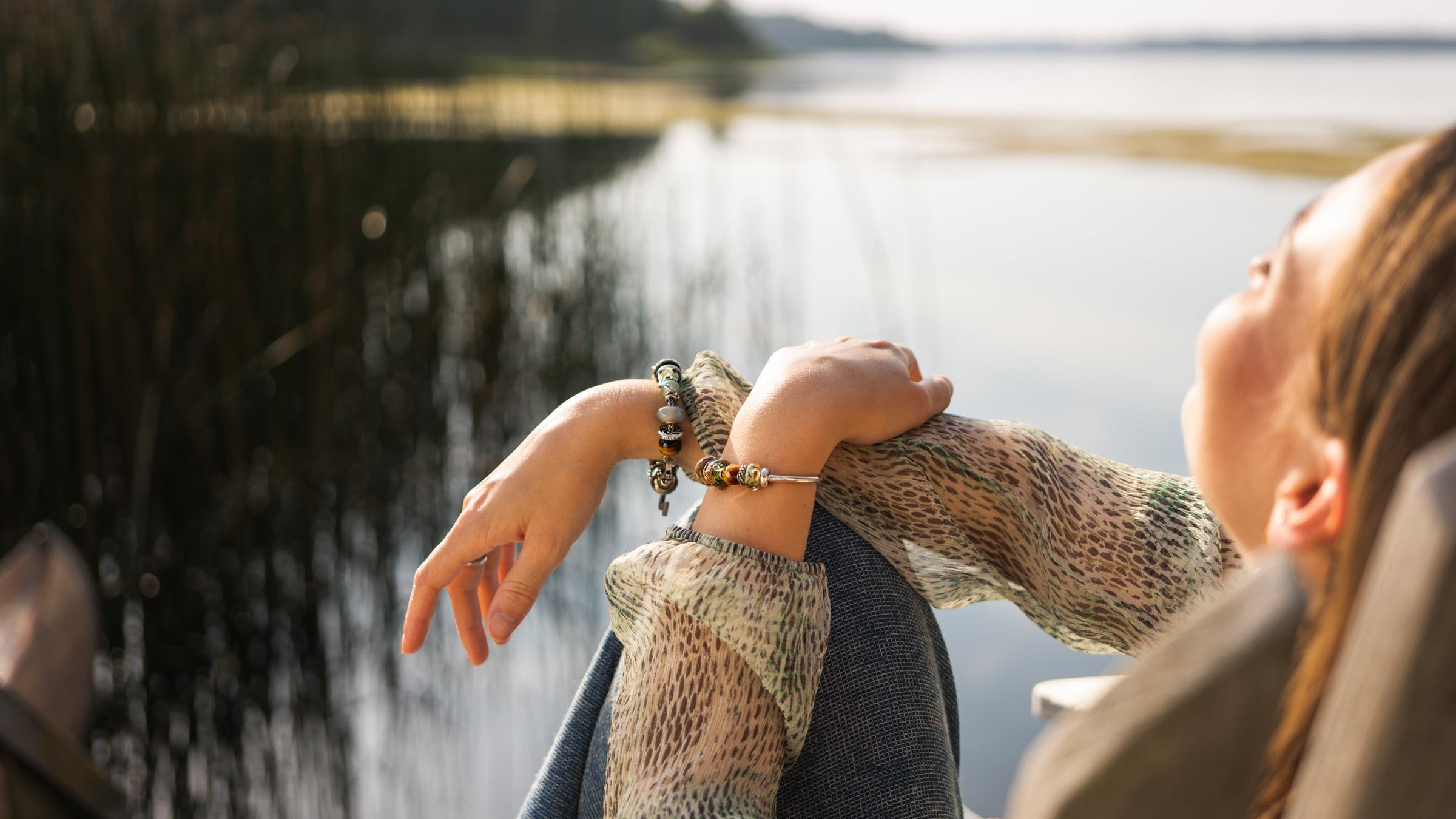 Model wearing a sweater and a christmassy bracelet with shimmering beads in glass and silver