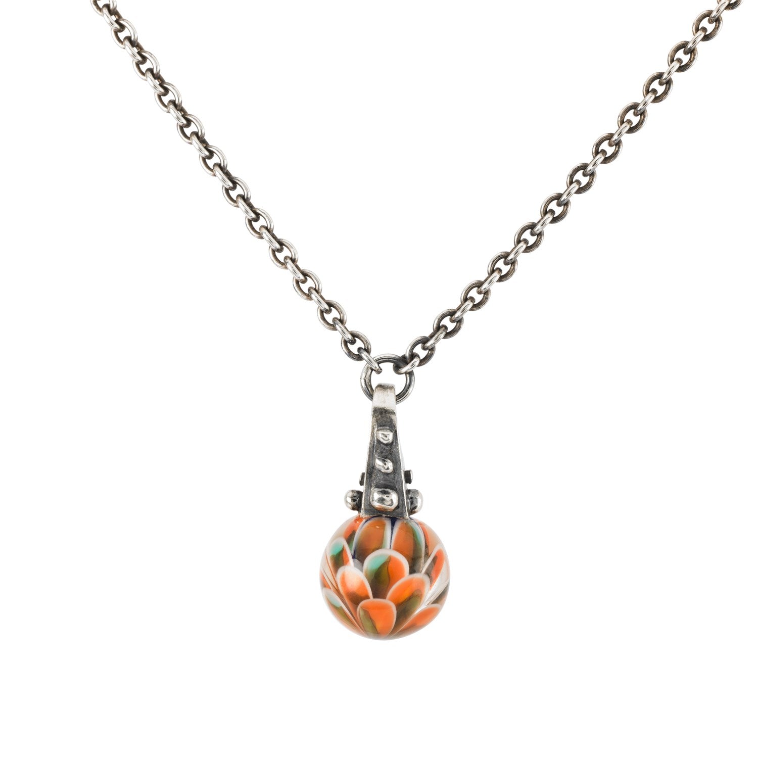 una bead de cristal redonda con hojas en naranja, verde y azul. El colgante es de plata con textura de corteza y gotas de rocío.
