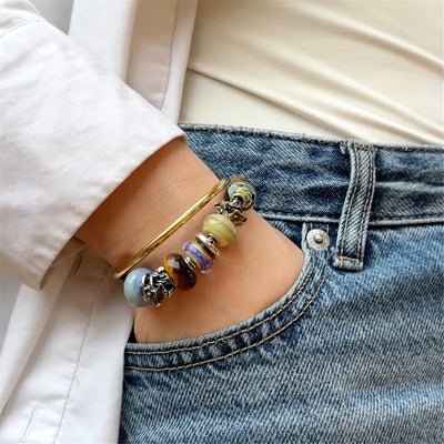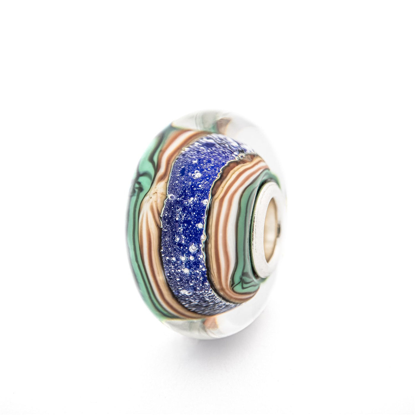 A murano glass bead from Trollbeads named Jusanji. It has swirls of green, caramel, beige, blue, and brown—echoing the tranquil reflections of sky, earth, and water. Inspired by the serene magic of the Jusanji Reservoir.